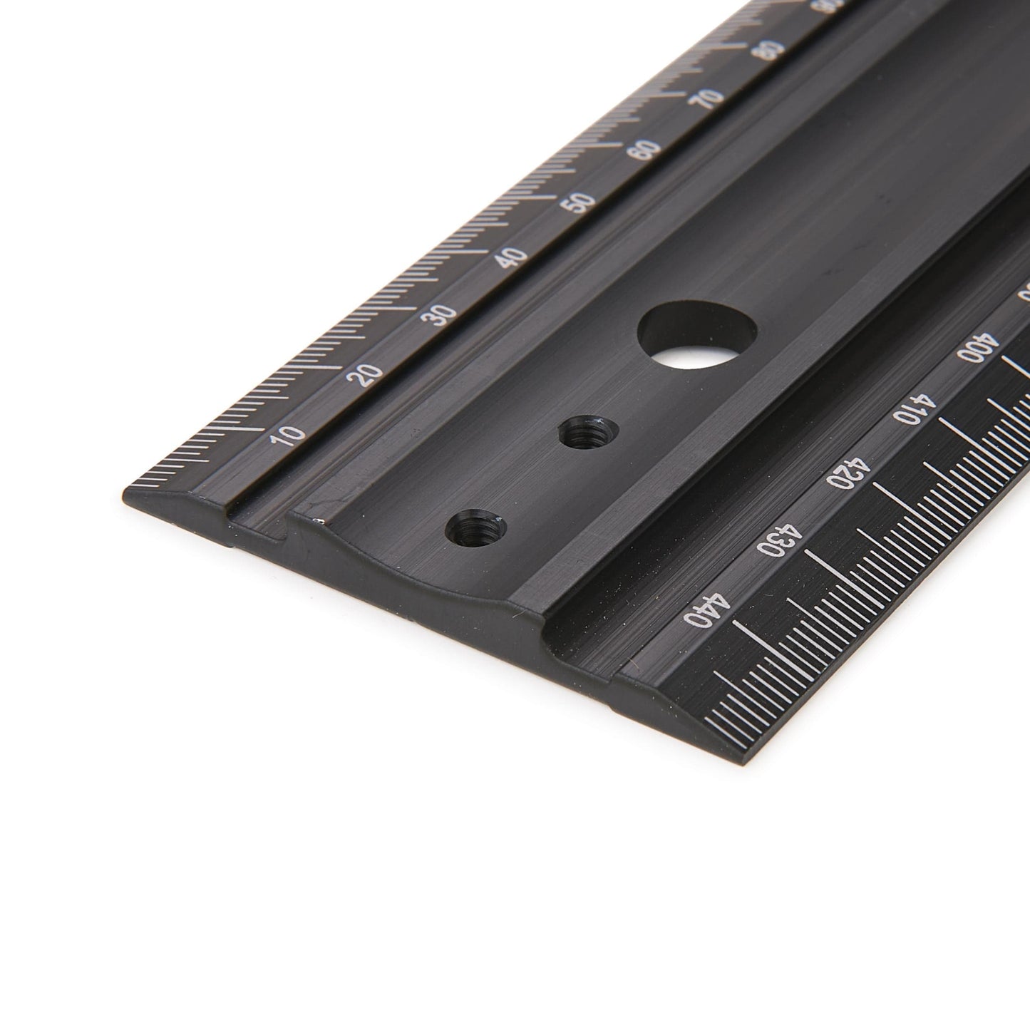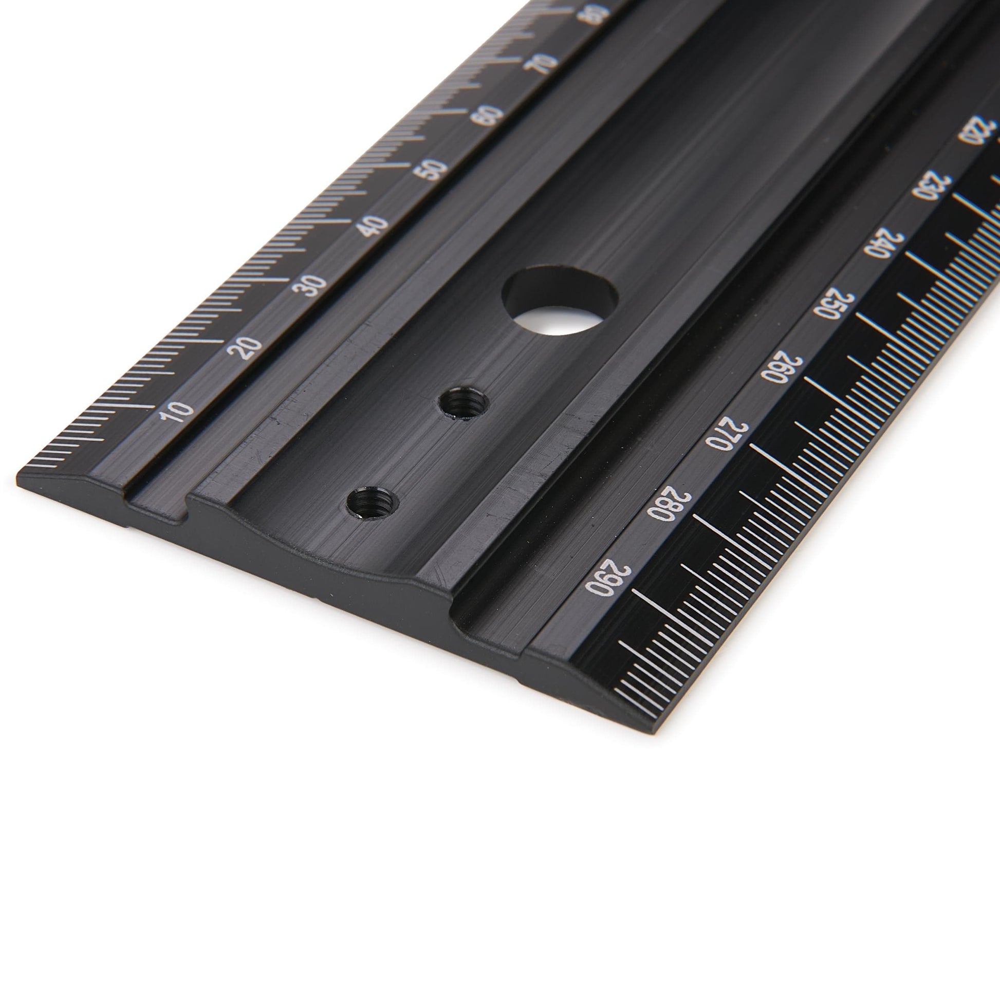 The Pinnacle® Straight Rule is made from an extruded aluminum profile, which features continuous grooves for handling and flatness, along with machined edges for straightness. Rules are black anodized for wear protection, with white laser engraving for visual contrast. One edge is engraved with left-to-right measurements, and the opposite edge is engraved with a center scale.
