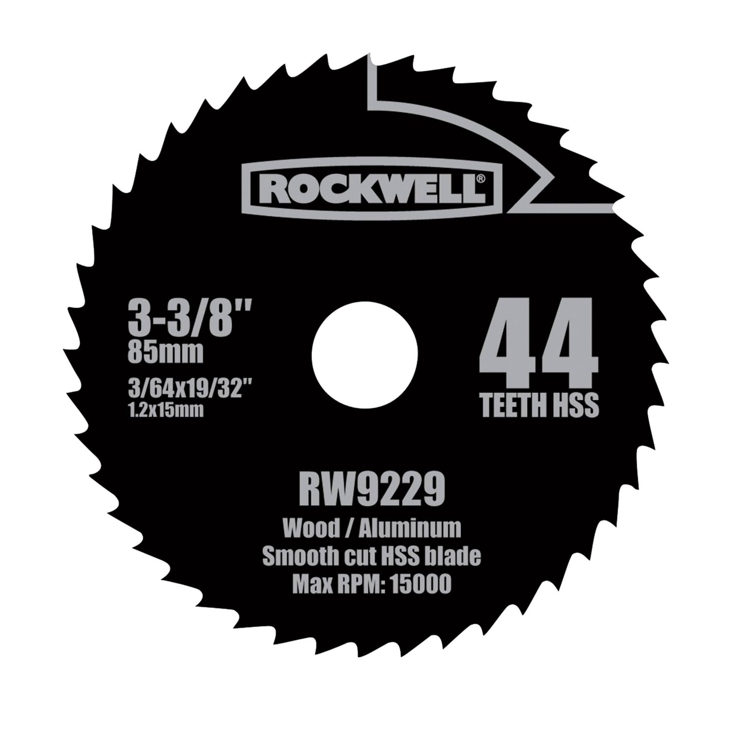 VersaCut 3-3/8 inch HSS blade from Rockwell, is 44 tooth and suitable for cutting aluminum, wood, plastic, and drywall.