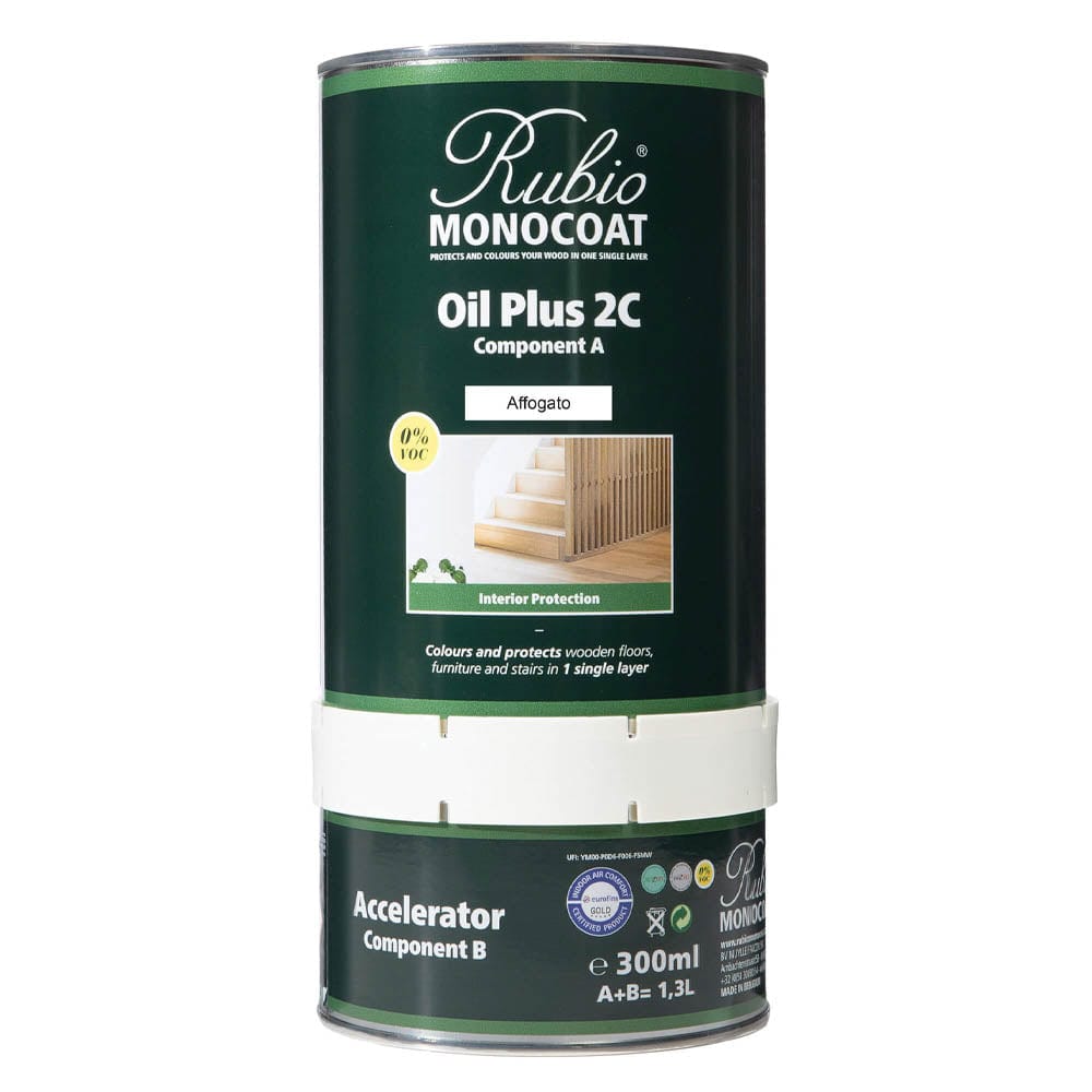 Rubio® Monocoat Oil Plus 2C (OP2C) is a revolutionary two-component version of the original Oil Plus formula, designed for added durability and a faster cure time with a single coat. The included accelerator allows the finish to reach full strength in just three to five days and improves resistance to wear, water, heat and common stains. Like the original, it uses molecular bonding to connect with the top microns of the wood fiber, producing a natural matte finish without forming a film.
