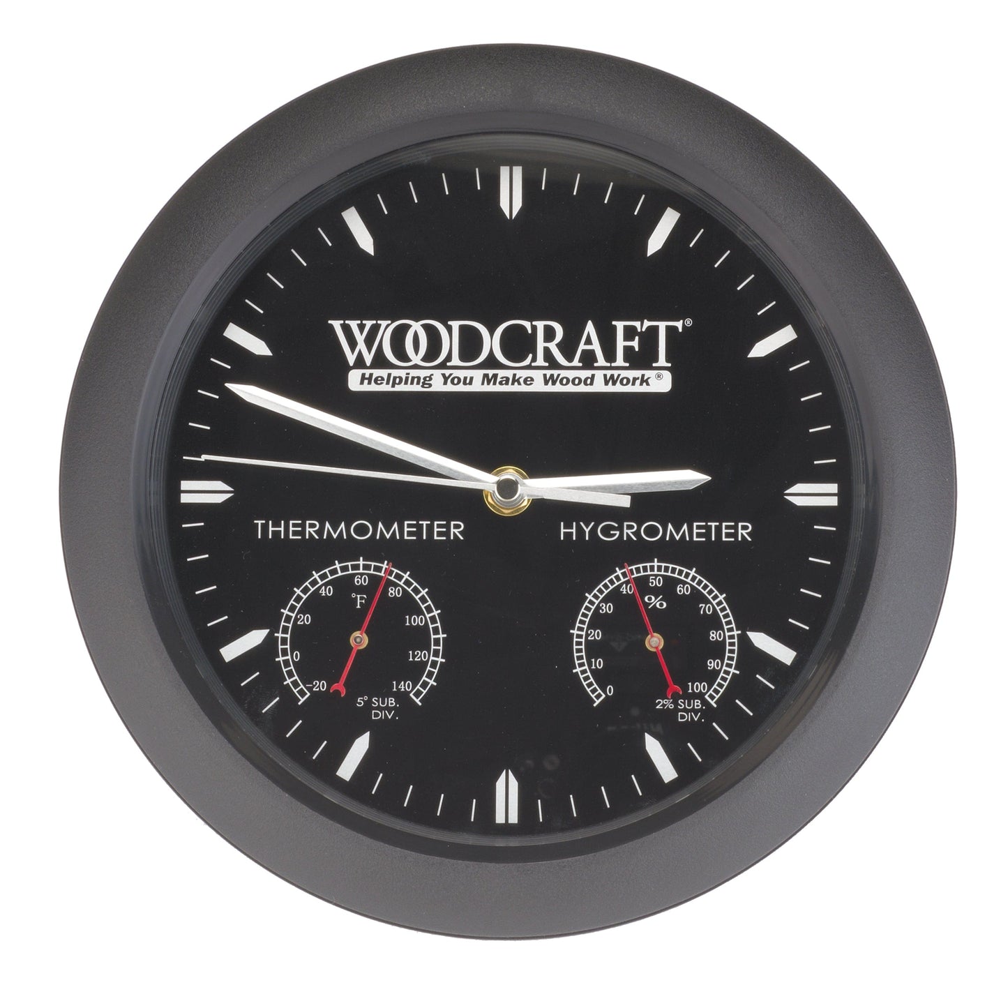 What a great addition to any shop! You’ll not only know the time, but also the temperature and humidity with our Woodshop Clock and integrated thermometer / hygrometer. With its 10" black face, chrome hands and markings, it’s easy to read and good looking too! Temperature is displayed in 5-degree increments (Fahrenheit), and the hygrometer shows relative humidity in 2% intervals.